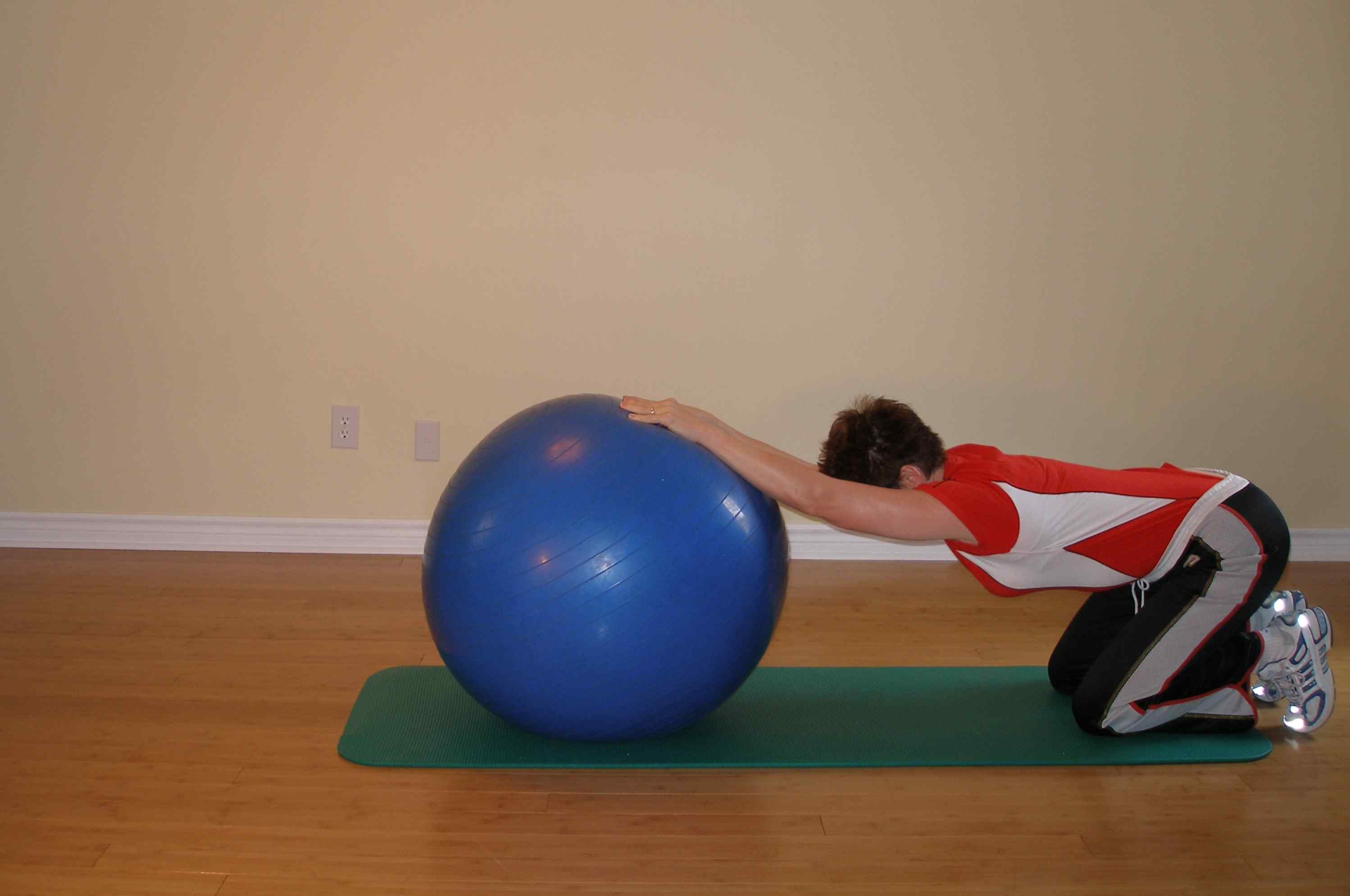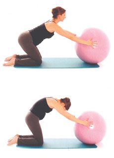 5) Ajoelhado no chão, apoie as mãos na bola. Sente-se nos calcanhares e deslize a bola para frente, alongando a coluna alinhada com o pescoço.