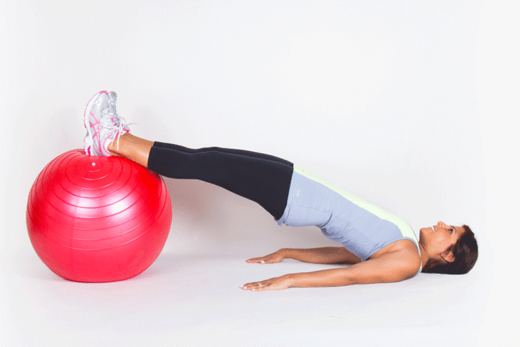 moça jovem com calça preta e blua azul claro puxando bola vermelha com os pés e quadris elevados